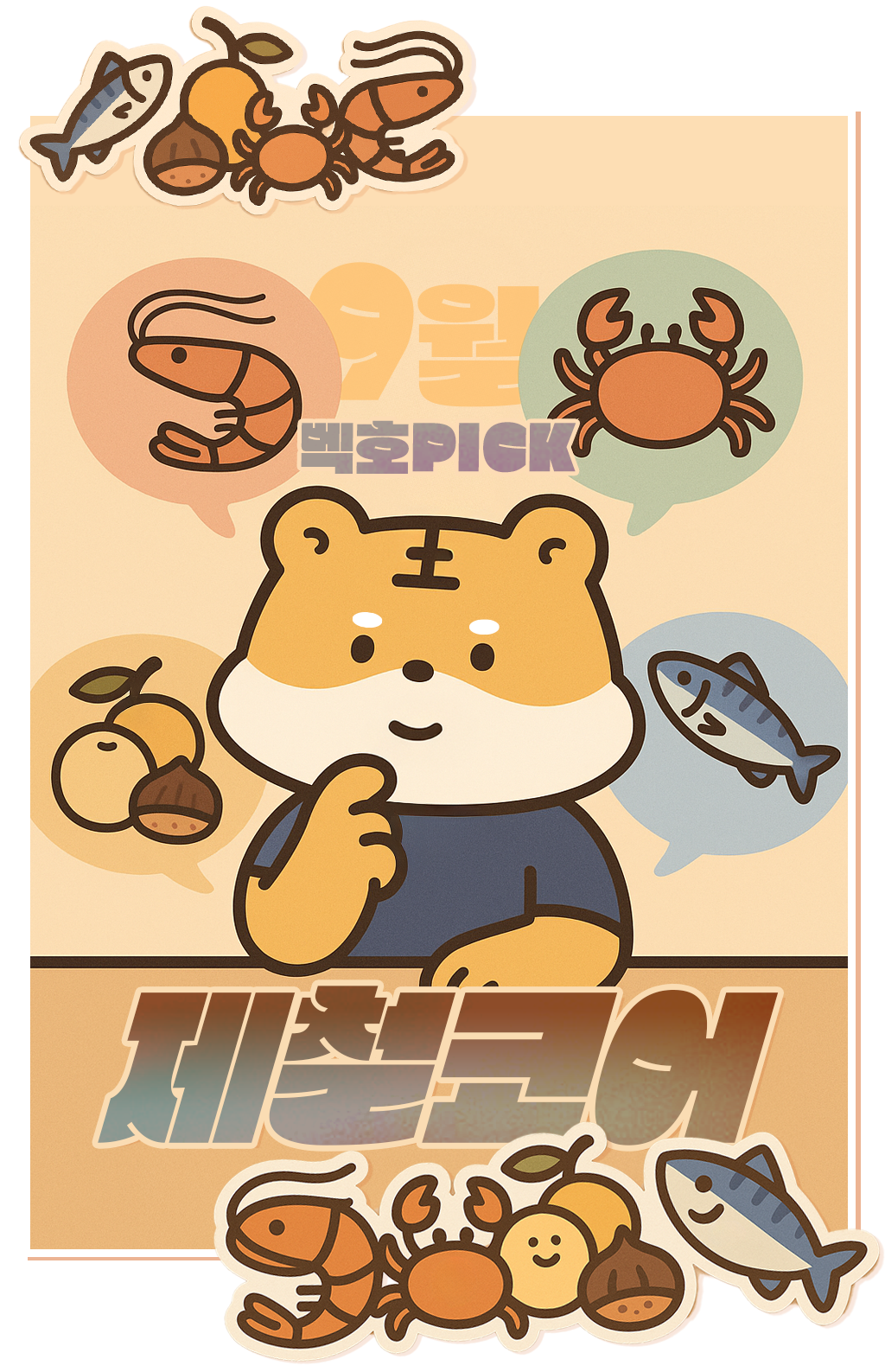 길어진 여름 때문에 입맛이 똑 떨어지진 않았어? 이럴 때일수록 잘 챙겨먹어야 한다구! 9월에는 고등어, 게, 대하, 전어, 고구마, 배, 밤 등의 다양한 맛도리 제철음식들이 있어! 가을이 입안에 들어오는 느낌 만끽하는 9월 보내길 바랄게!