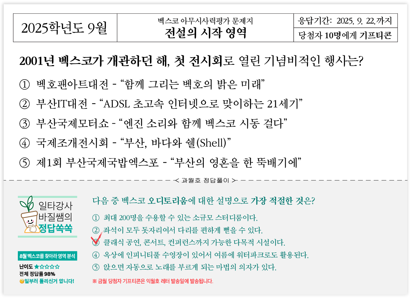 벡스코에 대해서 알아갈 겸 벡스코 아무시사력평가를 풀어보자구🤔 2001년 벡스코가 화려하게 개관하였지! 그 때 그 시절로 돌아가볼까? 정답을 맞춘 당첨자 10명을 추첨하여 네이버페이 포인트 1만원권 기프티콘이 팡팡! 다음달 퀴즈도 기대해줘!😃 |