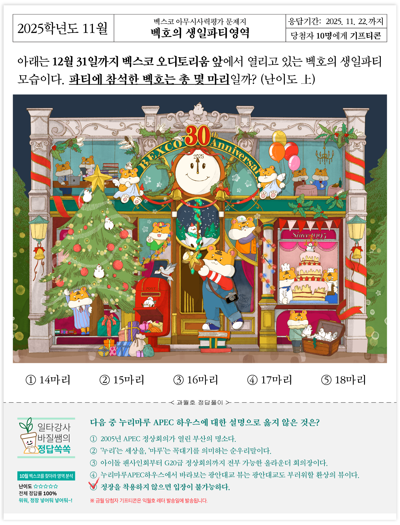 벡스코에 대해서 알아갈 겸 벡스코 아무시사력평가를 풀어보자구🤔 벡스코 오디토리움 야외 계단에서 열리고 있는 벡스코 크리스마스숲 블루노엘에 놀러오면 벡호랑 사진도 찍고 더 큰 사이즈로 자세하게 찾아볼 수 있어! 이번 퀴즈는 만만치 않을걸? 🤔꼭 사진을 클릭해서 크게 펼쳐놓고 세세하게 봐야해!!! 정답을 맞춘 당첨자 10명을 추첨하여 네이버페이 포인트 1만원권 기프티콘이 팡팡! 다음달 퀴즈도 기대해줘!😃 |